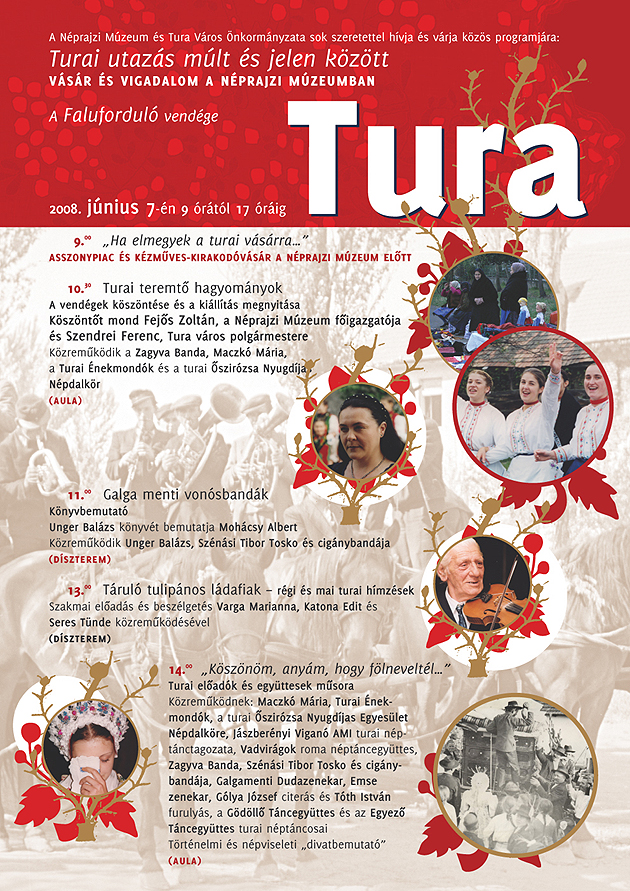 A Néprajzi Múzeum és Tura Város Önkormányzata sok szeretettel hívja és várja közös programjára: Turai utazás múlt és jelen között - vásár és vigalom a Néprajzi múzeumban. A Faluforduló vendége 2008. június 7-én 9-től 17 óráig: Tura.