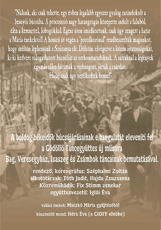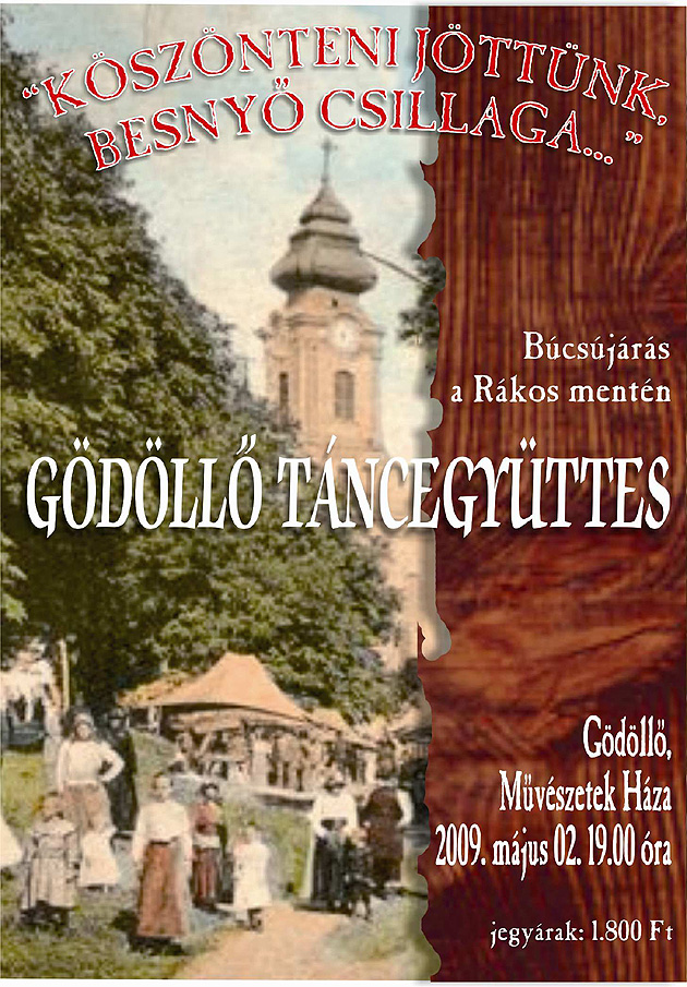 Búcsújárás a Rákos mentén 2009. április 21. A Gödöllő Táncegyüttes műsora 2009. május 2. 19:00 órás kezdettel. Vissza a hírekhez