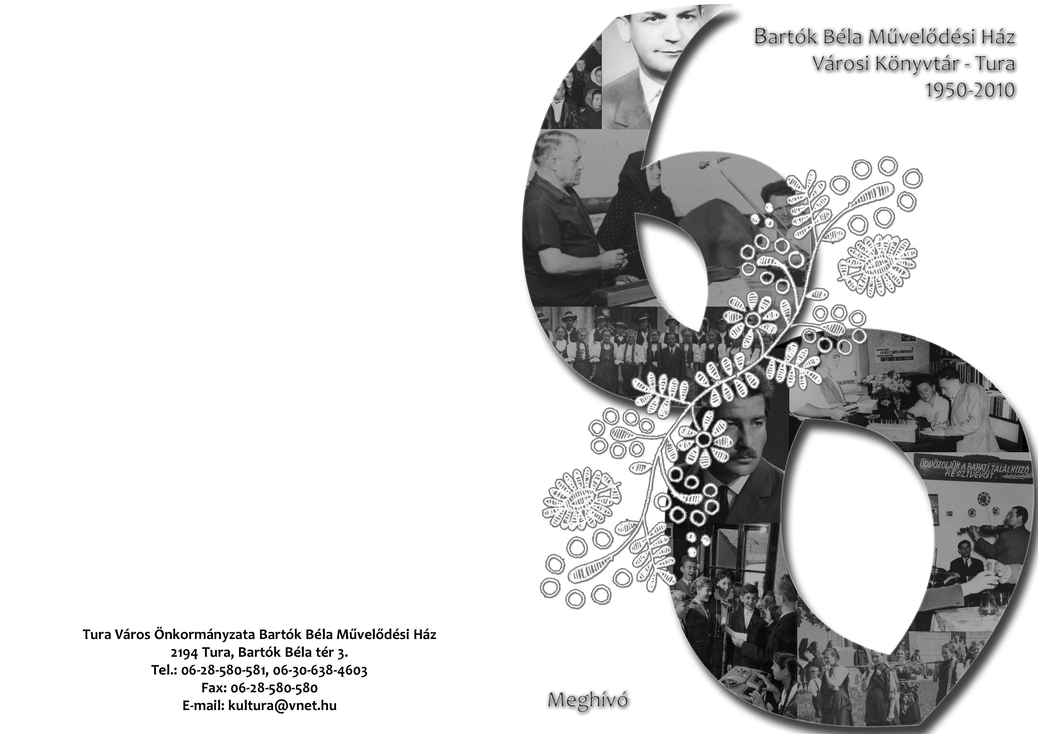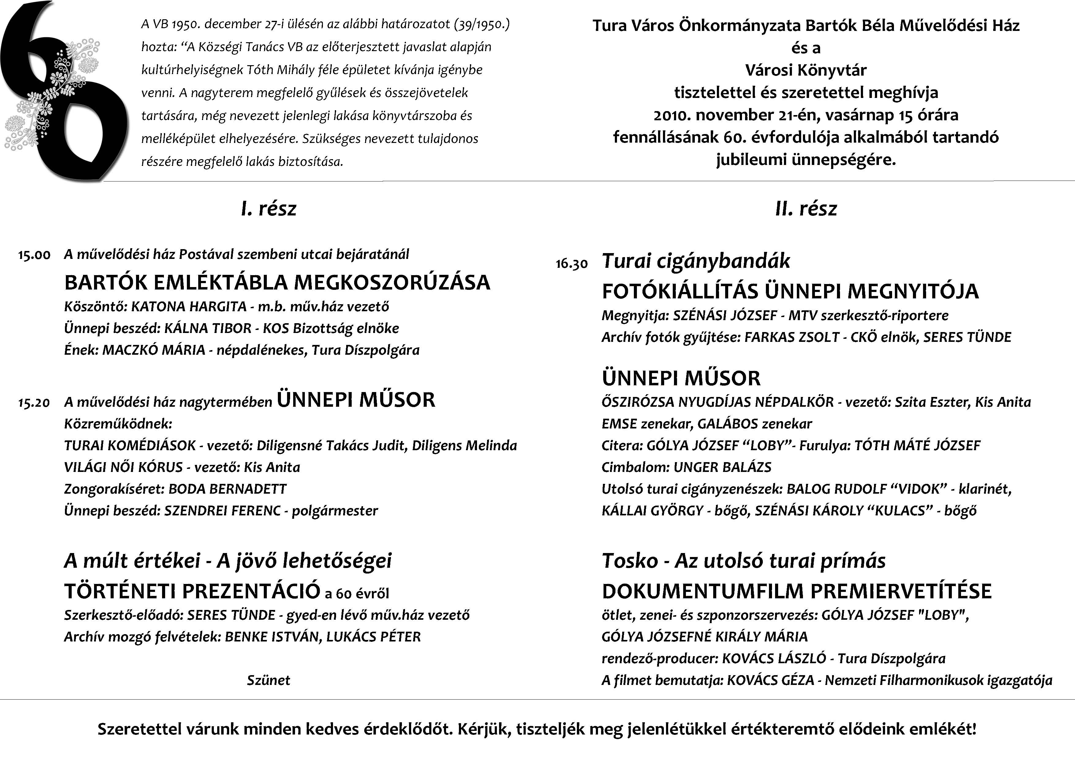 A turai Bartók Béla Művelődési Ház és a Városi Könyvtár idén ünnepli fennállásának 60. évfordulóját. Ezen jeles alkalomból 2010. november 21-én, vasárnap 15 órai kezdettel jubileumi ünnepséget tartunk, melyre szeretettel invitáljuk Önt is.