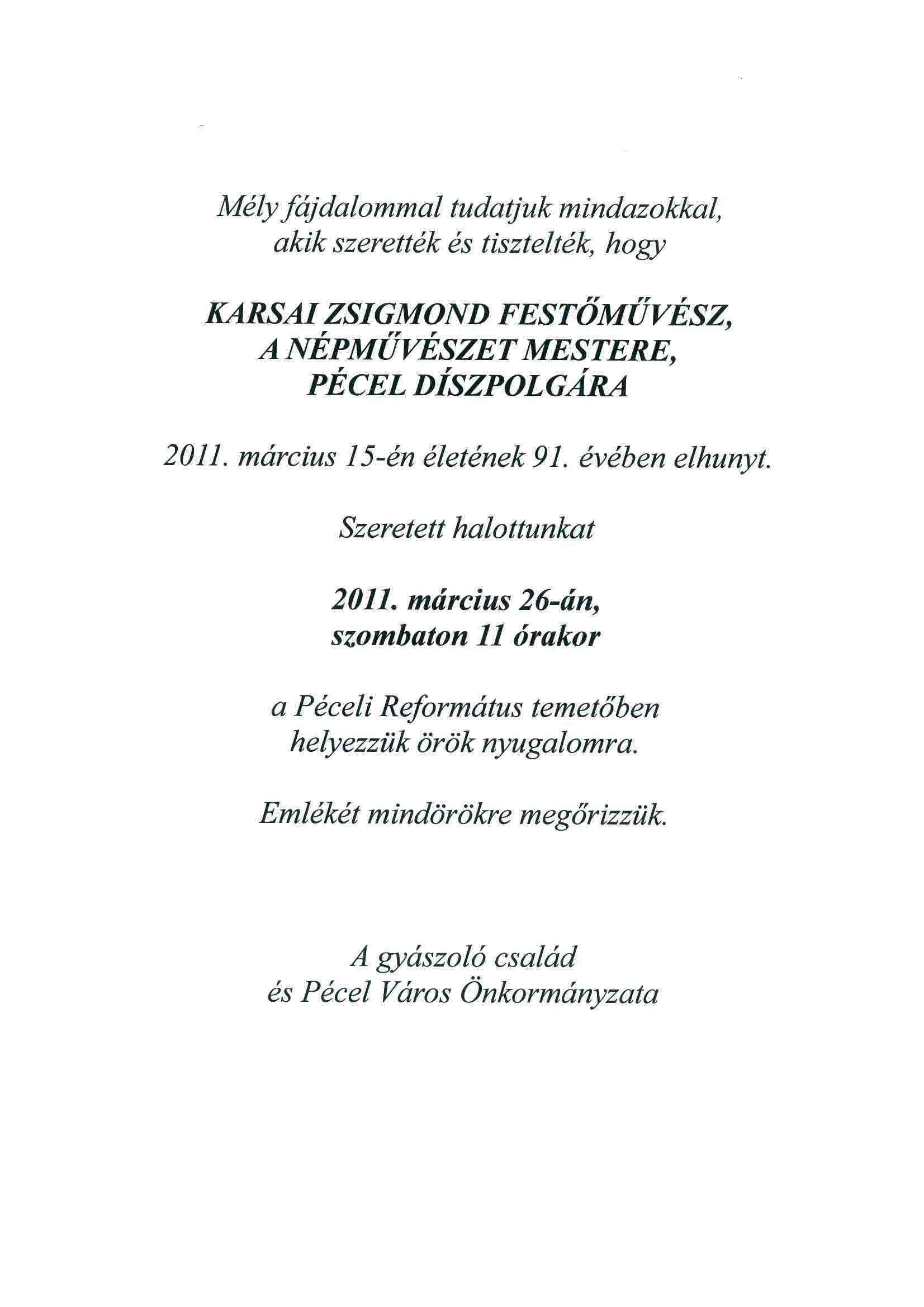 Elhunyt Karsai Zsigmond 2011. március 17. 2011. március 16-án hosszú betegség után 91 éves korában elhunyt Karsai Zsigmond. Vissza a hírekhez
