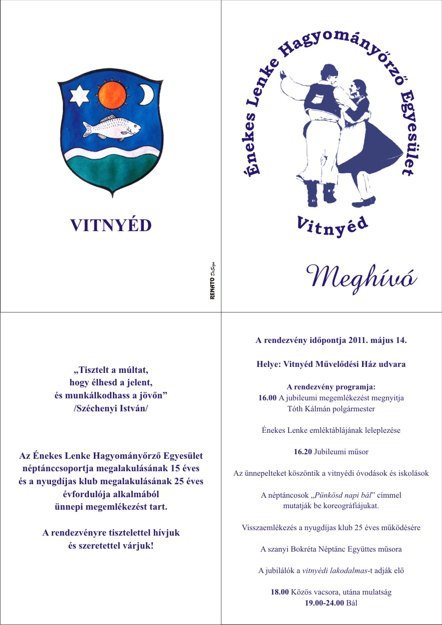 Szeretettel invitállak benneteket 2011.május 14.-én délután az Együttesünk jelenlegi felállásának 15 éves és a vitnyédi népdalkör 25 jubileumi műsorára.